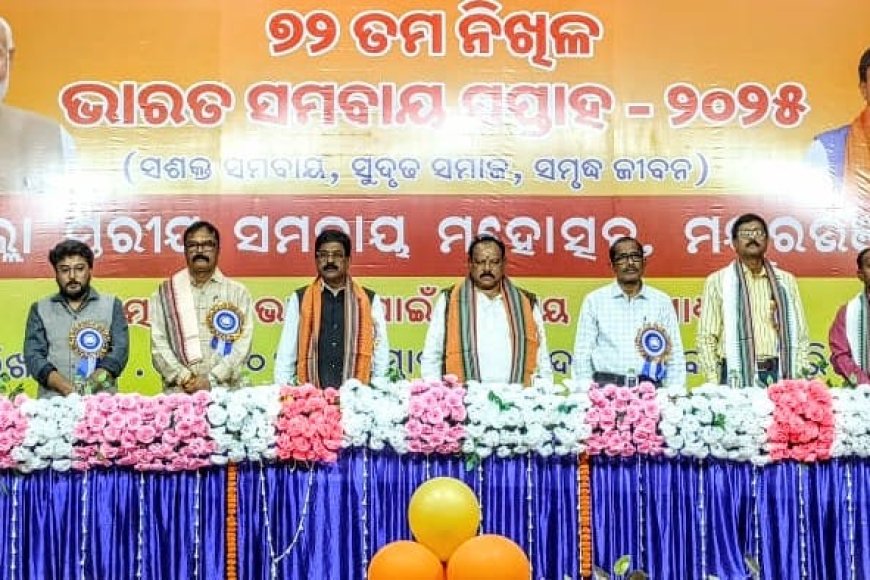 Baripada 19/11 (PNS) On the occasion of the 72nd Nikhil India Cooperative Week, Mayurbhanj District Cooperative Festival was held at the local Martyr’s Memorial Bhavan in Baripada. Baripada MLA Prakash Soren was the chief guest at the festival organized under the patronage of Sub-Cooperative Societies, Subramanyam Mohanty, President of Mayurbhanj Central Co-operative Bank was the chief guest, Additional District Magistrate Netranand Mallick, DDM Smarak Mohanty of NABARD, Senior Assistant Superintendent Tushar Kumar Kanti Mohanty, Basant Naik, Sukuram Singh, Distt. Pradeep Upadhyay, President of the Co-operative Union, attended and said that Co-operatives are the source of social and economic development. On this occasion, distinguished co-operative Lakshmi Sahu was specially felicitated and meritorious students of school and college level competitions were awarded. The program was attended by district cooperative workers, members of the management council, farmers and officers of various departments, while Senior Assistant Nibandhan Basant Kumar Naik expressed his thanks. At the beginning of the program, the famous puppet dance was performed by the Uttarasahi Theater Institute.