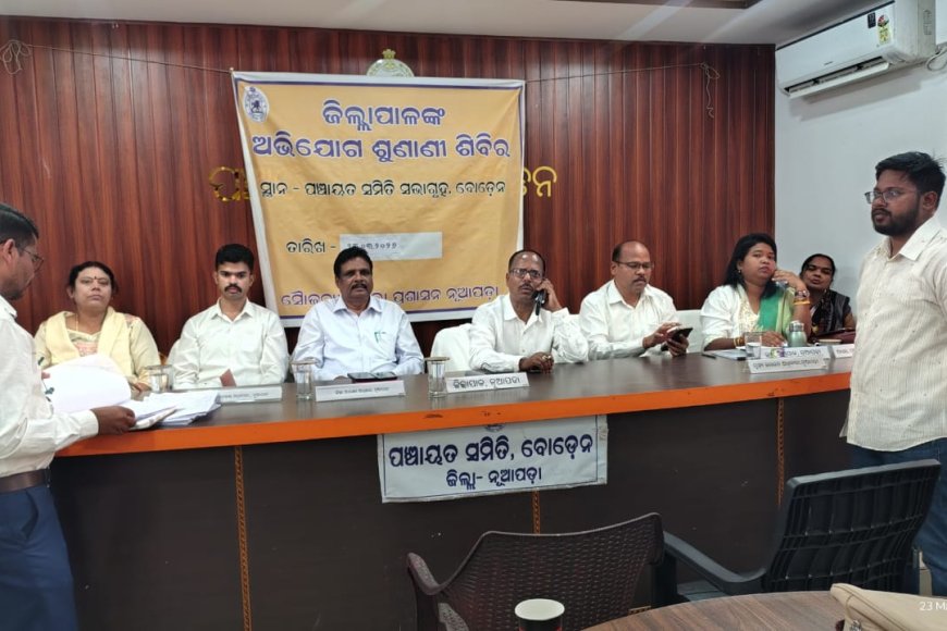 District Magistrate’s Grievance Hearing Camp has been held in Boden Block of Nuapada district. District Magistrate Madhusudan Das along with Bankhand Officer (Provisional) Aziz Khan, Bankhand Officer (Kendusalay) K Madhabilata, IFS Probation’s Arnab Samantharai, District Chief Development Officer Lambodar Dharua, Deputy District Magistrate Surmi Soren, District Chief Medical Officer Dr. Dhaneshwar Sethi, Boden Pachayat Committee Chairperson Premshila Nag was present in today’s camp. The District Magistrate heard 62 complaints of 40 individuals and 22 groups. He directed the concerned district level officials to take immediate action on all these complaints. Similarly, Mrs. Hirendri Bagh of Khairvadi village and Shyambandhu Manigarahi of Binapur village have been given 10 thousand rupees from the Red Cross fund. Boden Tehsildar Sarita Gupta, Deputy Collector Chinmay Sagar assisted in managing the major camp. In the meeting, all district level officers, engineers of various departments, line department officers and block level officers and employees and representatives of various media were prominently present. On this occasion, programs on Migrant Labor Awareness Camp, One Tree for Girl Child, One Day for Unborn Child, One Day for Animals and Plastic Free Campaign were organized in Rokal Gram Panchayat. A medical camp for pet birds was also organized by the Department of Animal Husbandry under the title of Day for Animals l